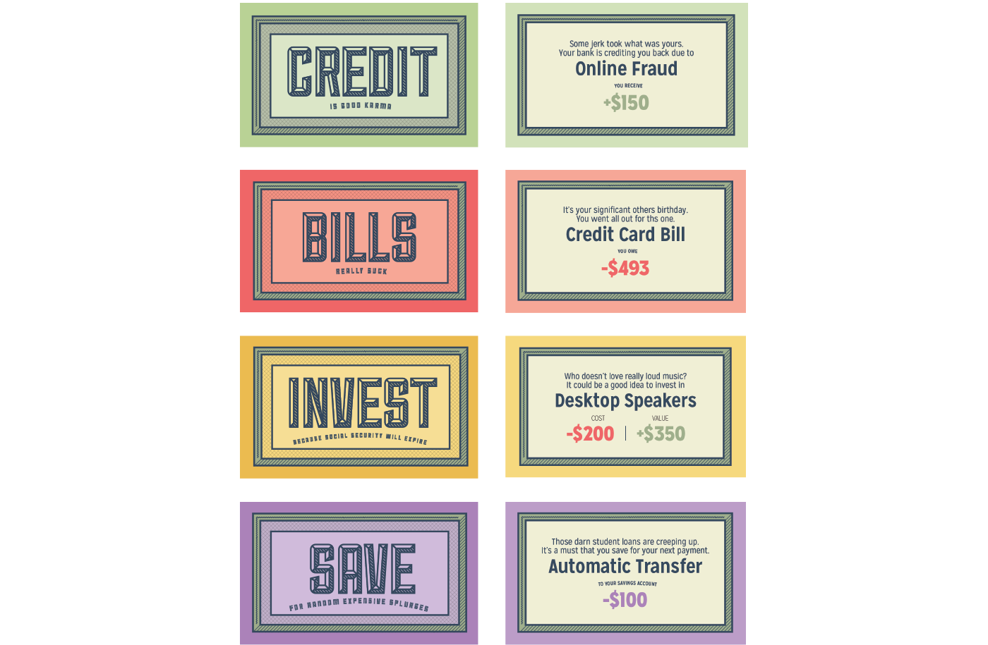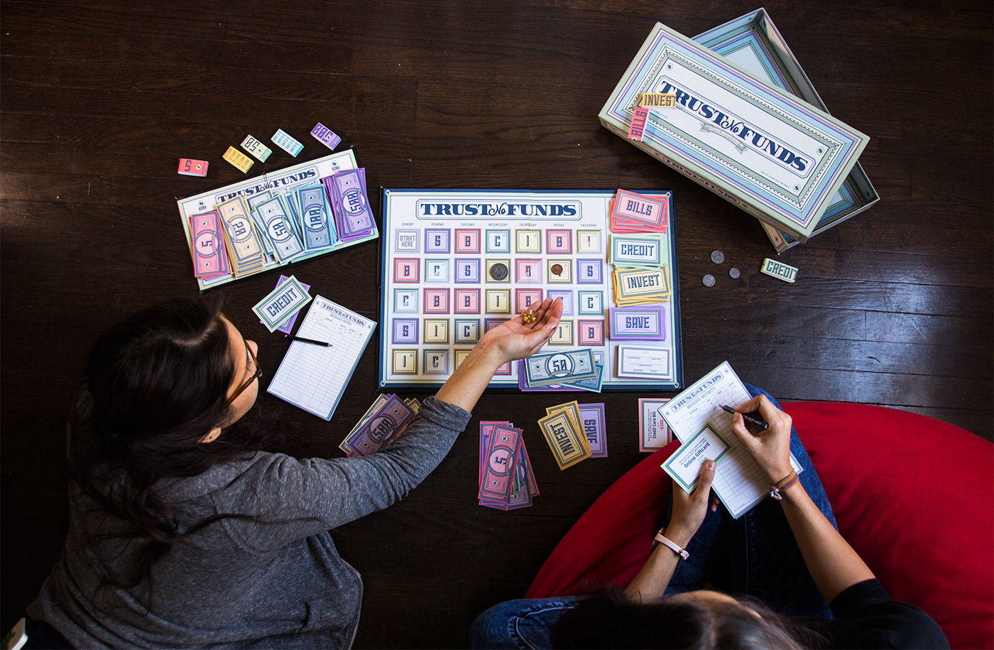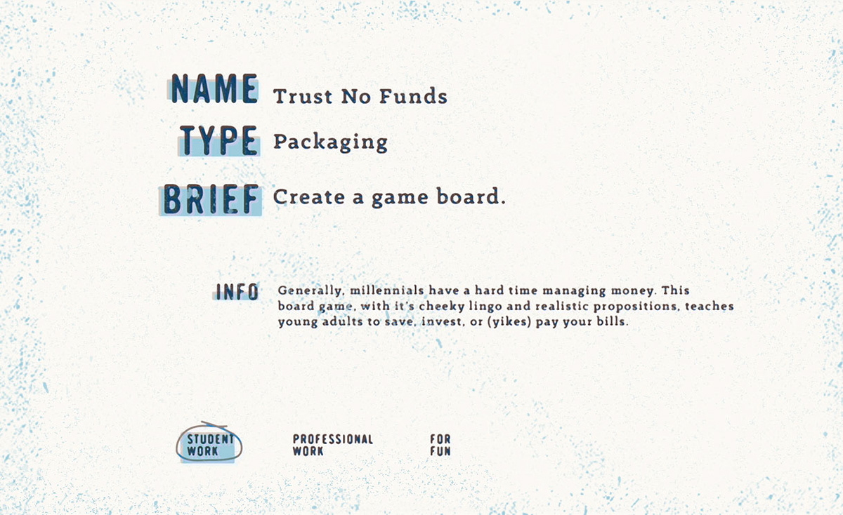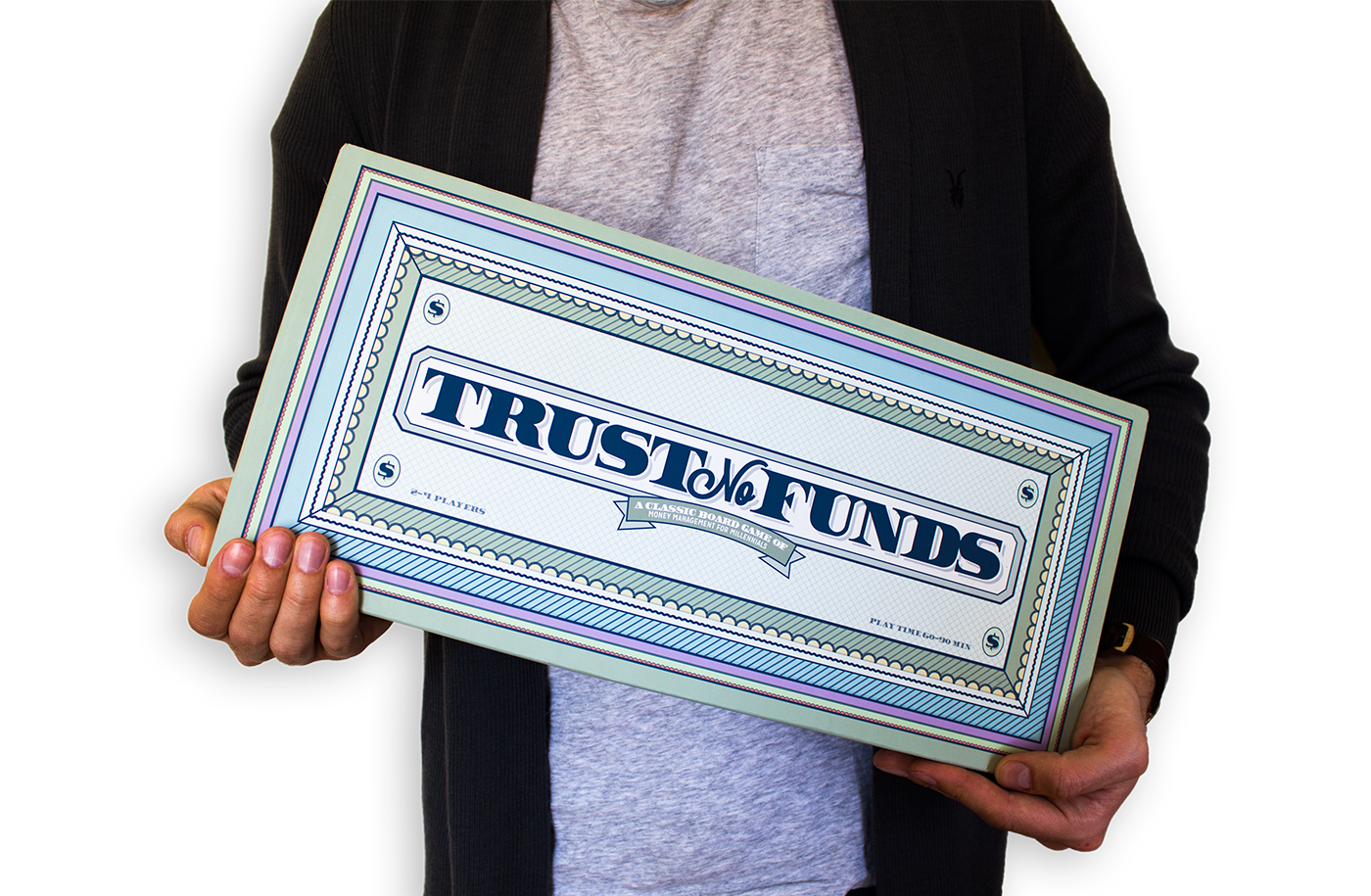 Trust No Funds is a fictional board game meant to teach millenials how to balance investments and debts in a manner that is light hearted in nature.